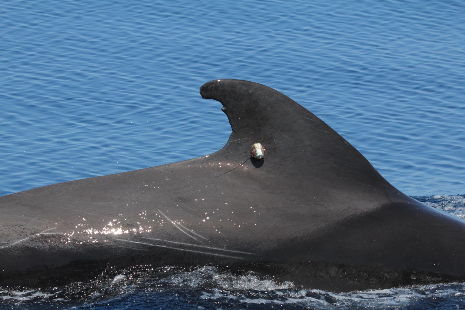 Short-finned pilot whale (GmTag176) equipped with a satellite-linked dive recorder off Cape Hatteras on 16 May 2017. NOAA Permit 14809.