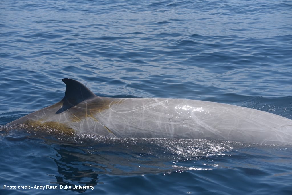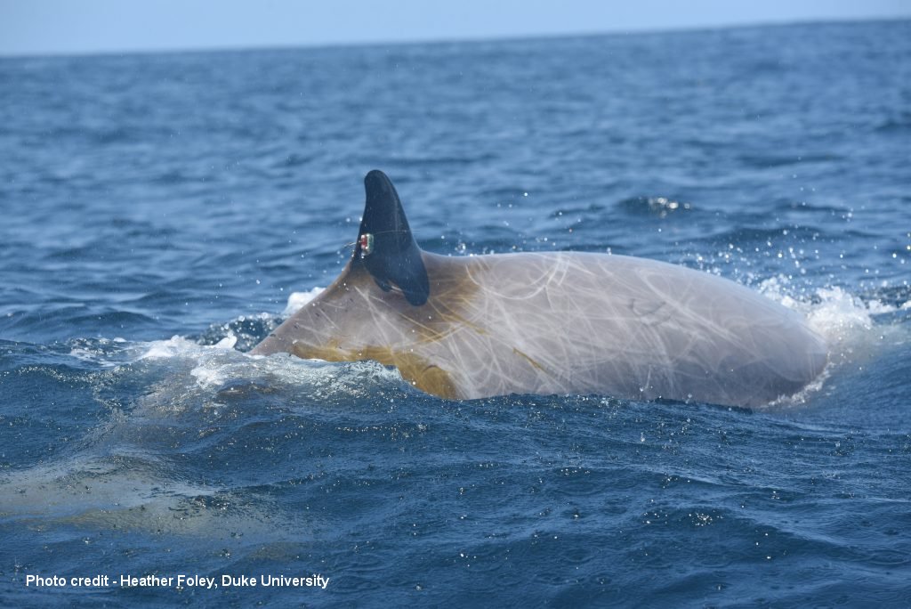 The focal beaked whale, carrying its satellite-linked dive recording tag. Photo by H.J. Foley, Duke University, under NOAA Research Permit No. 22156.