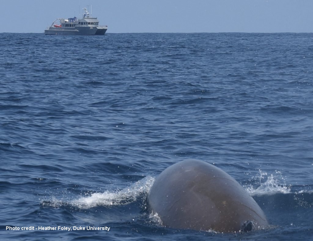 A Cuvier's beaked whale surfaces with the R/V Shearwater in the background. Photo by H.J. Foley, Duke University, under NOAA Research Permit No. 22156.