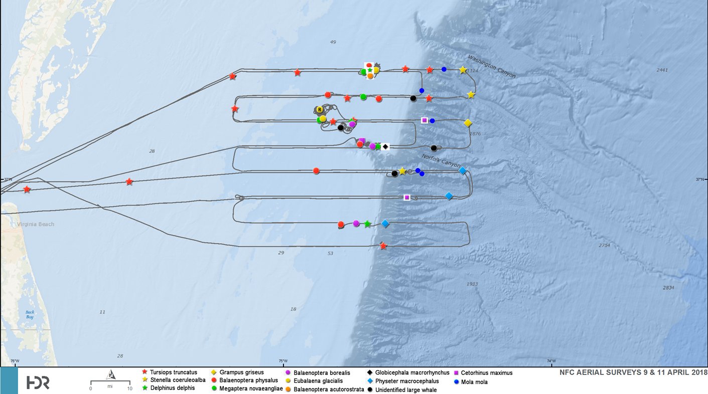 The HDR research team completed their first aerial surveys of the year as part of the Navy’s baseline data collection effort for the Norfolk Canyon study area off the coast of Virginia on 9 and 11 April 2018. These surveys resulted in sightings of some exciting animals, including several endangered species! In total, there were 51 sightings of over 600 individuals, representing 11 marine mammal species across two days of aerial surveying.