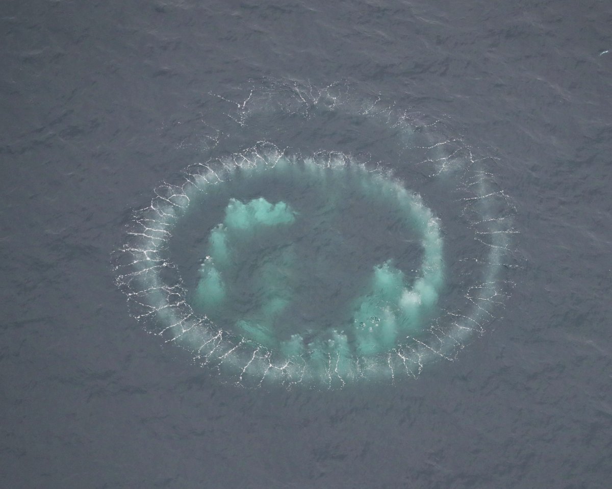 Atlantic Right Whale Sighting Advisory System (SAS) and a temporary Dynamic Management Area (DMA) was established to warn mariners of the presence of these highly endandered whales - only approximately 450 individuals remain in the population. Within the same sighting, the team also observed five humpback whales, three endangered fin whales, and a minke whale, all feeding in the immediate vicinity. The humpbacks were bubble net feeding, where whales blow bubbles in a spiral to trap and concentrate prey, allowing them to swim up through the center of the bubble “net” to feed. Other notable sightings on the survey included Risso’s dolphins, striped dolphins, and common dolphins. In addition to marine mammals, several basking sharks were also observed feeding on zooplankton prey.