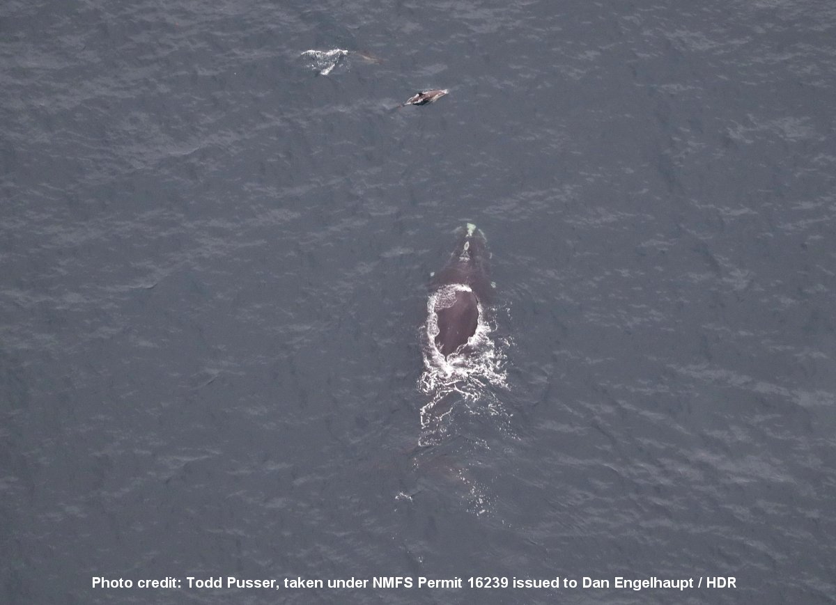 Critically endangered North Atlantic right whales observed during an aerial survey on April 9. Common dolphins were also seen "bow riding" just off the rostrum of the right whales (right photo).