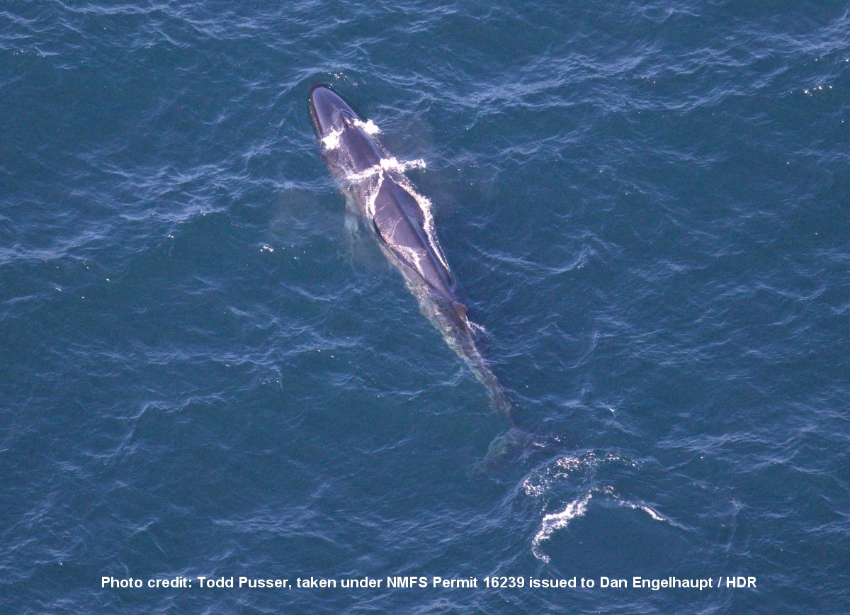 On April 11 HDR ran a boat-based visual survey as part of the Mid-Atlantic Outer Continental Shelf Break Cetacean Study in addition to the aerial survey. The vessel crew's first sighting was a humpback whale, but soon they received a call that the aerial team had again located right whales. The boat headed to that area and had 12 sightings of 5 species – including three right whales (one of which was a resighting from the previous day). A fecal sample was collected from the right whales, which will be sent to other researchers for analysis. Other species sighted included five endangered fin whales, three more humpback whales, and common dolphins. However, perhaps just as notable as the right whale sightings was a sighting of a juvenile blue whale. This blue whale sighting may be the first photographic record of this species in the area, with only sightings known from further offshore as part of NOAA’s AMAPPS surveys and an offshore tag track from an individual tagged off Canada. The Aerial team also had a sighting of an endangered sei whale.