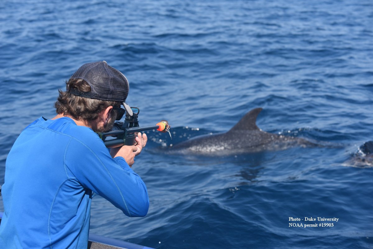 The crew was rewarded for the long offshore trips, with sightings of short-finned pilot whales, a species only seen twice during vessel surveys since the project began in JAX in 2009, and successfully deployed four tags on them. It will be fascinating to see where these animals travel. Interestingly, none of the 40 short-finned pilot whales tagged off Cape Hatteras have traveled further south than Onslow Bay, NC. Additionally, last year, several photo-identification matches were made between pilot whales at this JAX site and a catalog maintained by the Bahamas Marine Mammal Research Organization, run by Diane Claridge, so it’s possible these animals are part of a completely separate population than the NC animals. Stay tuned to see if these tagged animals head to the islands!