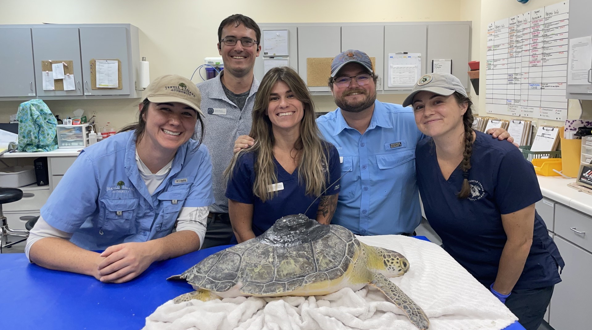 The juvenile green turtle was discovered on Little Cumberland Island and treated at the Georgia Sea Turtle Center (GSTC) on Jekyll Island for a severe shell infection and fibropapillomatosis. Following rehabilitation and being cleared by Georgia Sea Turtle Center veterinary staff, the turtle was fitted with a satellite tag and released from Jekyll Island.