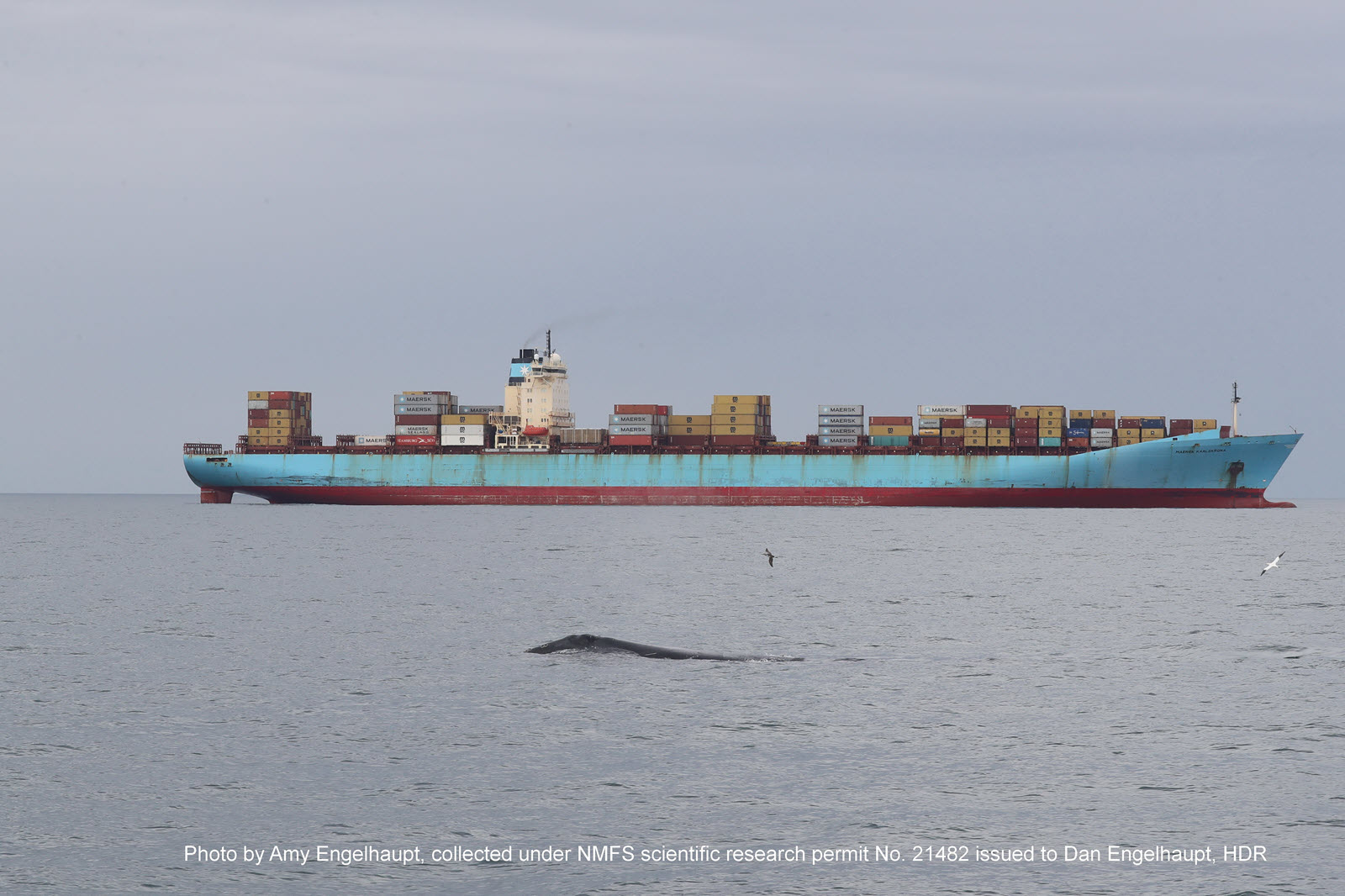 North Atlantic right whale on 29Jan2023 off the coast of Virginia Beach, VA near a container ship at anchor