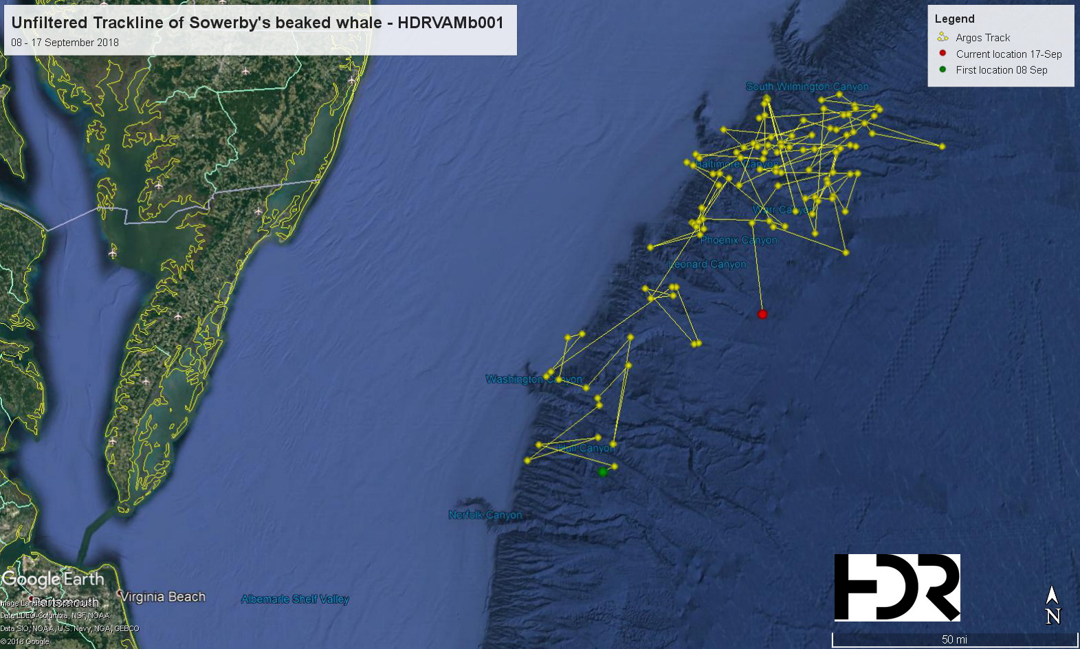 Sowerby's beaked whales have also been detected consistently throughout the year on a high frequency acoustic recording package (HARP) deployed between the Washington and Norfolk Canyons (~1000m depth) from April 2016 through June 2017 as part of the passive acoustic component of the Baseline Monitoring for Marine Mammals in the East Coast Range Complexes project conducted by Duke University. So while Sowerby's beaked whales seem to be a regular inhabitant of this area, they are very rarely observed from visual surveys.