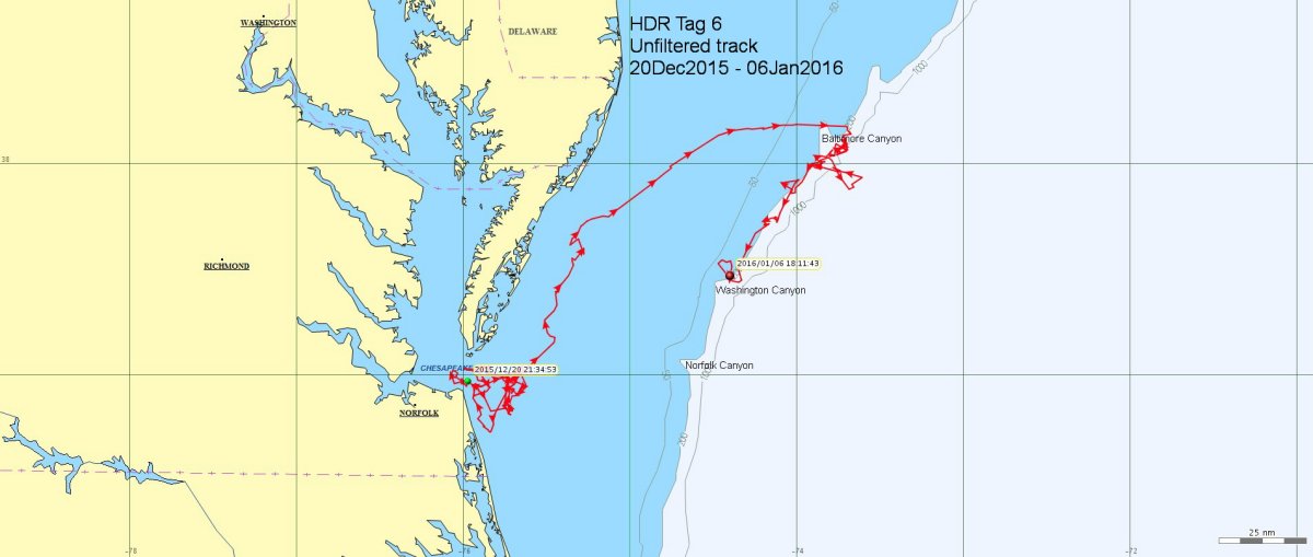 We hoped we would locate the pair again, but information from the satellite-tagged individual showed that on December 28th the tagged whale began a journey north towards Baltimore Canyon, a productive offshore canyon 140 miles to the northeast of where we’d first seen the pair. As of January 6th we are still receiving information from this whale and it had traveled a total of 573 nautical miles since we initially deployed the tracking tag. The individual is currently located near the Washington Canyon, 83 miles northeast of Cape Henry. We wonder – is the pair still together and will they return to Virginia Beach this season? Check back for additional updates……