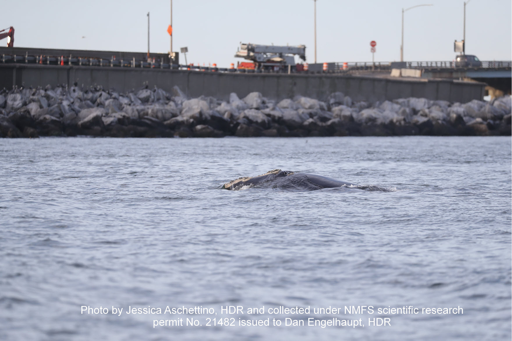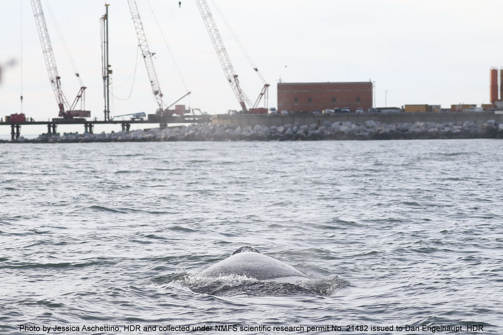 North Atlantic right whale near the construction on the Chesapeake Bay Bridge Tunnel. The preliminary identification of this whale is the 2022calfof2753, so it is a yearling that is potentially newly independent of its mom.