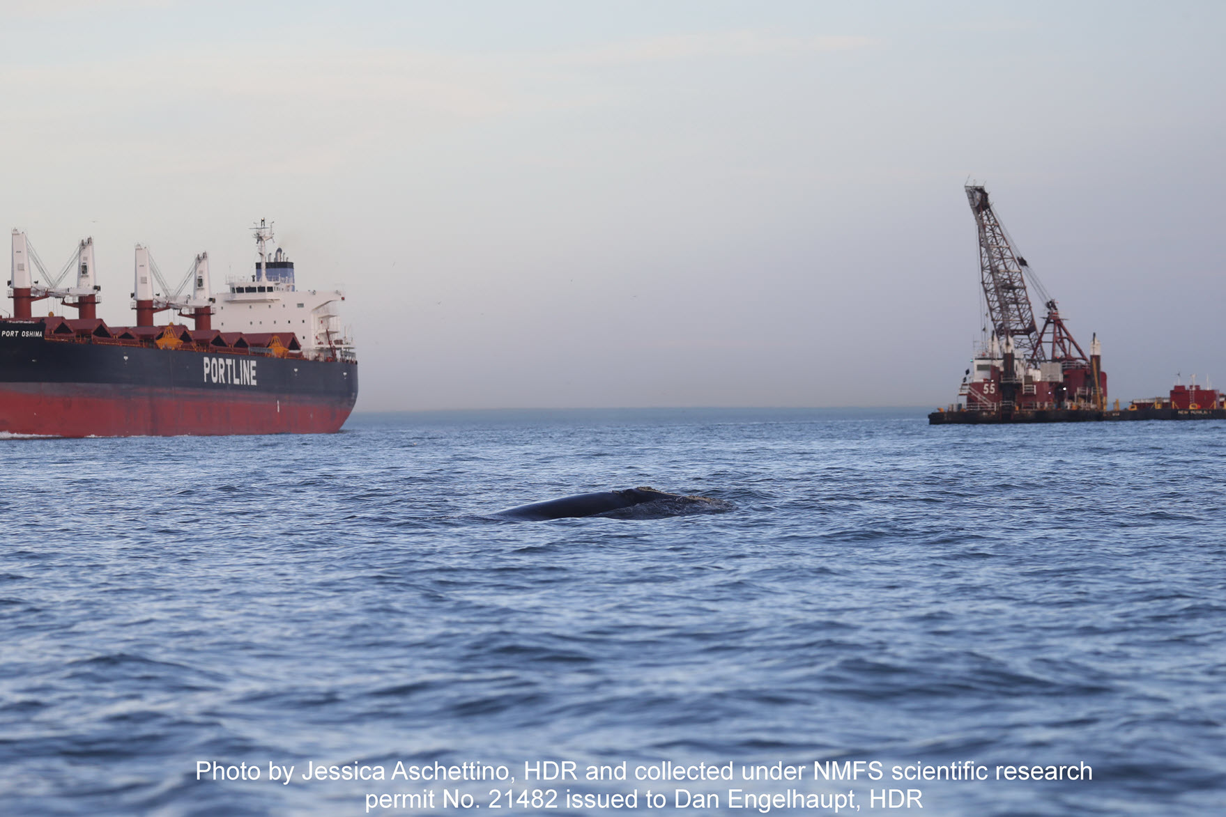 On 18 January 2023, HDR sighted a yearling right whale near the Chesapeake Bay Bridge Tunnel, between the two islands that support the first section of tunnel. This area is the major shipping channel that leads into the Chesapeake Bay, serving the two major ports of Norfolk and Baltimore. Although North Atlantic right whales commonly migrate along the coast in relatively shallow shelf waters, this particular individual was unusually close to shore and in an area that put it at significant risk of being struck by a vessel – one of the leading causes of mortality for right whales. This sighting was just inside the mouth of the Chesapeake Bay and therefore outside the boundary of the Seasonal Management Area for ship speed reductions (an area where ships that are 65 feet or greater must travel at or below 10 knots). Our team quickly alerted the National Marine Fisheries Service and U.S. Coast Guard who issued a Notice to Mariners alerting all vessels to use caution when traveling through the area.