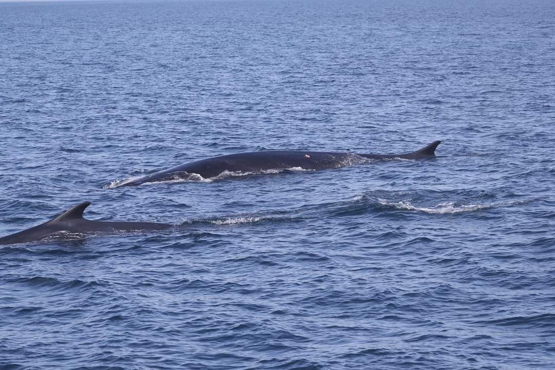 Between 25 May – 01 June, our team completed 5 offshore vessel surveys, logging more than 60 hours of effort, and flew two supporting aerial surveys. Every time we found more groups of baleen whales – and more NARW. Many of the aggregations appeared to be actively feeding – large patches of bait fish at the surface as well as at depth, and vertical tail fluke deep dives common. We deployed 2 CATS tags (1 overnight) and 3 DTAGs (2 overnight) on North Atlantic right whales as well as deployed 2 SPLASH10-F satellite tags and 1 DTAG (overnight) on fin whales and collected one biopsy. We’re excited to see what the data from these tag deployments might reveal about the whales’ activities below the surface. From the vessel, we’ve had 65 sightings of 7 cetacean species, including 10 sightings of NARWs, 28 sightings of fin whales, 11 sightings of humpback whales, 11 sightings of common dolphins, 3 sightings of bottlenose dolphins, 2 sightings of Risso’s dolphins, 1 sighting of pilot whales, and 3 loggerhead sea turtle sightings. The plane had 15 sightings of 4 species (4 NARWs, 7 fins, 3 humpbacks, and 1 minke). We have documented more than 20 individual North Atlantic right whales, including #3270/Pico and her newly discovered calf.